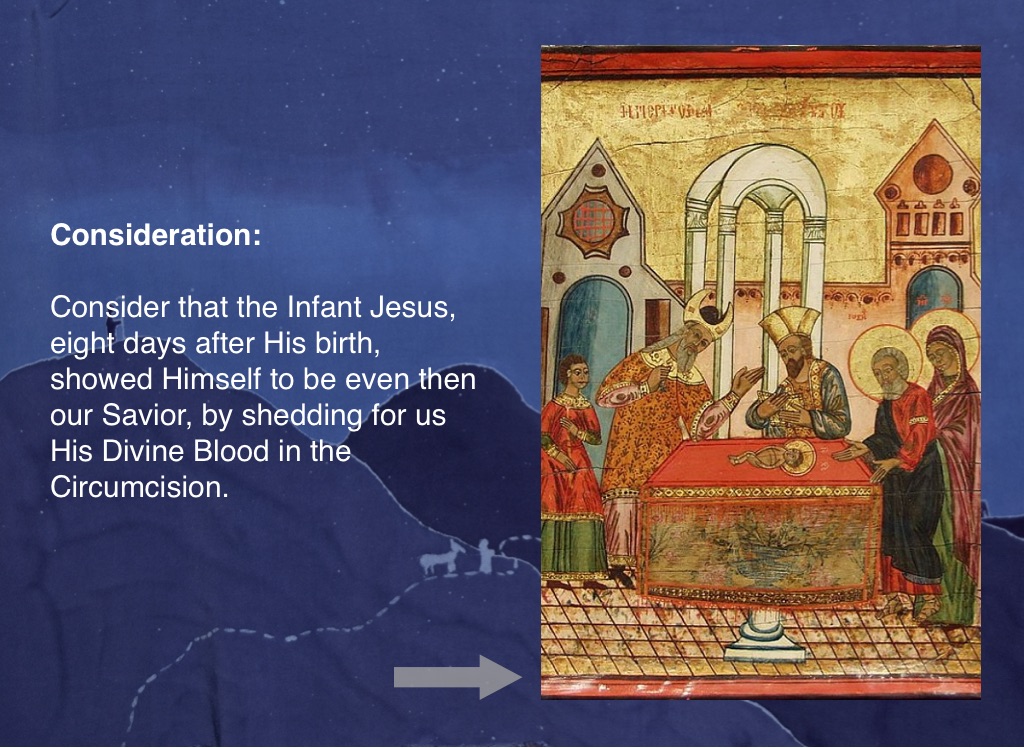 Consider that the Infant Jesus, eight days after His birth, showed Himself to be even then our Savior, by shedding for us His Divine Blood in the Circumcision.