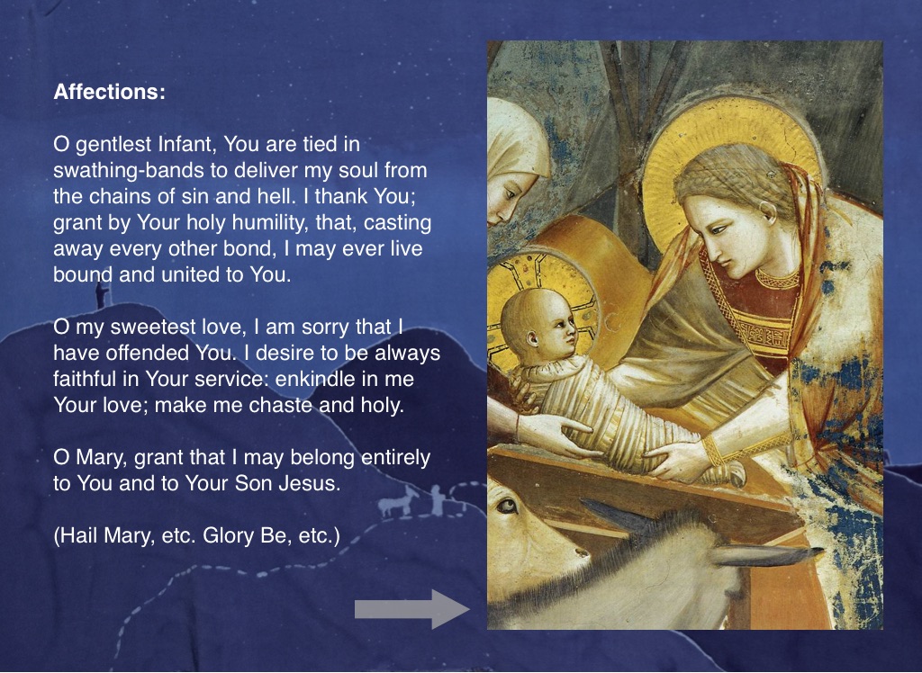 O gentlest Infant, You are tied in swathing-bands to deliver my soul from the chains of sin and hell. I thank You; grant by Your holy humility, that, casting away every other bond, I may ever live bound and united to You.