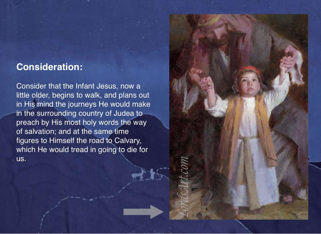 Consider that the Infant Jesus, now a little older, begins to walk, and plans out in His mind the journeys He would make in the surrounding country of Judea to preach by His most holy words the way of salvation; and at the same time figures to Himself the road to Calvary, which He would tread in going to die for us.
