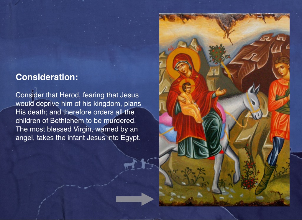 Consider that Herod, fearing that Jesus would deprive him of his kingdom, plans His death; and therefore orders all the children of Bethlehem to be murdered. The most blessed Virgin, warned by an angel, takes the infant Jesus into Egypt.