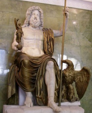The god Zeus has the goddess Nike in his hands. He has the power to rule over his people, he is always right and always wins.