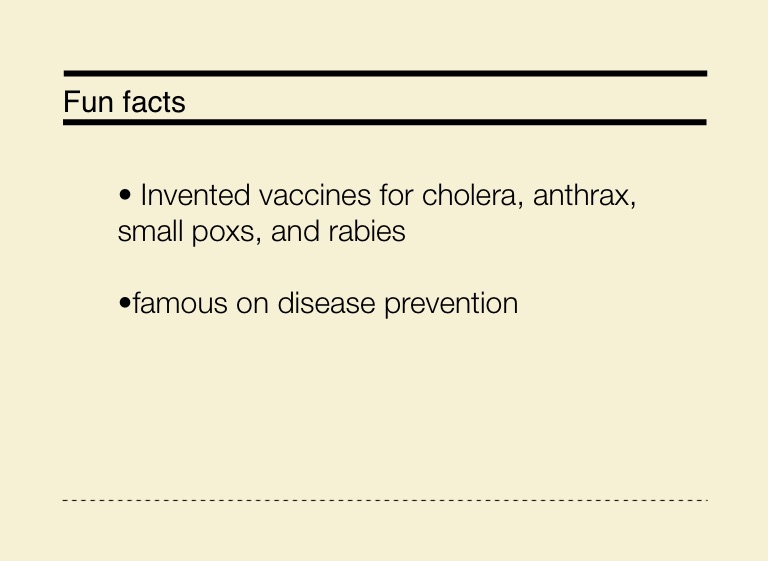 • Invented vaccines for cholera, anthrax, small poxs, and rabies