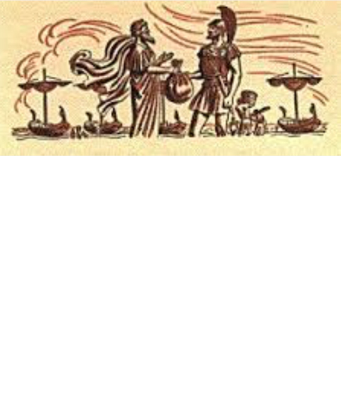 Below right: Odysseus' men open the bag of winds which sails them back to Aeolia. Aeolus becomes angry and refuses to help Odysseus again. Aeolus orders Odysseus and his men off of his island.