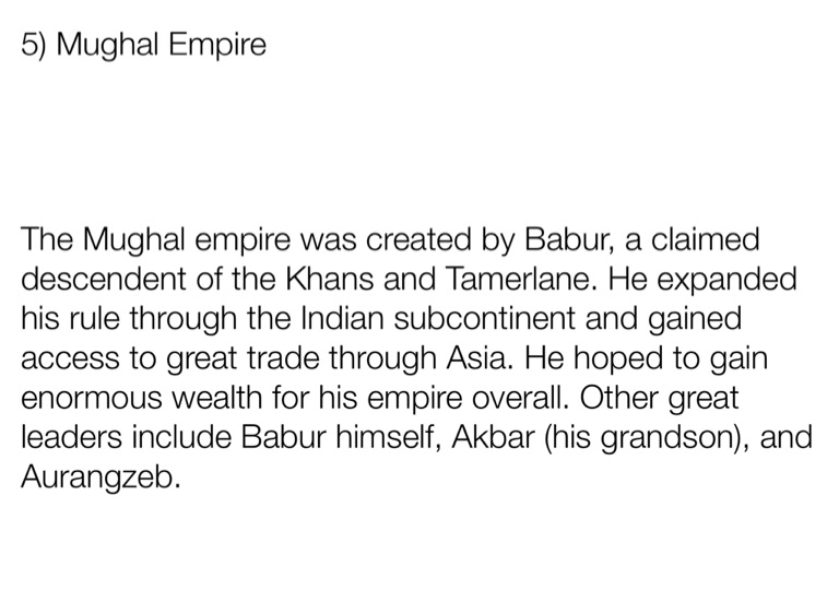 The Mughal empire was created by Babur, a claimed descendent of the Khans and Tamerlane. He expanded his rule through the Indian subcontinent and gained access to great trade through Asia. He hoped to gain enormous wealth for his empire overall. Other great leaders include Babur himself, Akbar (his grandson), and Aurangzeb.