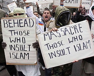 The veils used in the Middle East is stereotypically believed by some (mostly westerners) that Muslim women in veils are associated with terrorism. Innocent women even got abused and tormented because of this stereotype against muslims and their beliefs. After 9/11, women claimed that they were being called "Osama Bin Laden" and getting abused for looking like terrorists.The attacks led people to say to Muslims, "Either you are with us, or you are against us." Many people decided that all Muslims were against "us" and wanted any person they saw that had a headscarf on dead. Muslims started protests because they were offended by this stereotype. The picture shows Muslims during a protest. They are trying to show how upset they are because of how they are being insulted. Muslims in this protest wanted whoever insults Islam to be killed. The problem is similar to "Persepolis" because when Marjane's mom is insulted in the street, she gets very upset and went on a protest afterwards as well. Even though Marjane's mother was insulted for not wearing a veil, it had the same effect as these Muslims.