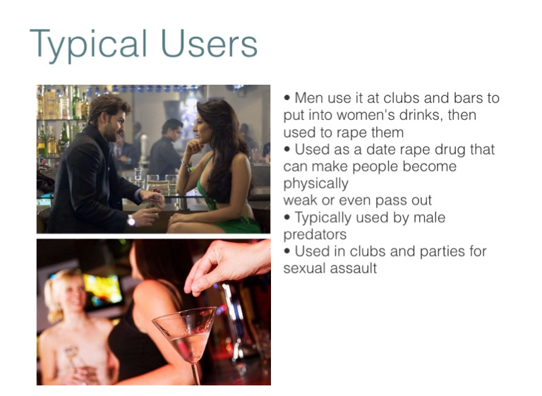 • Men use it at clubs and bars to put into women's drinks, then used to rape them