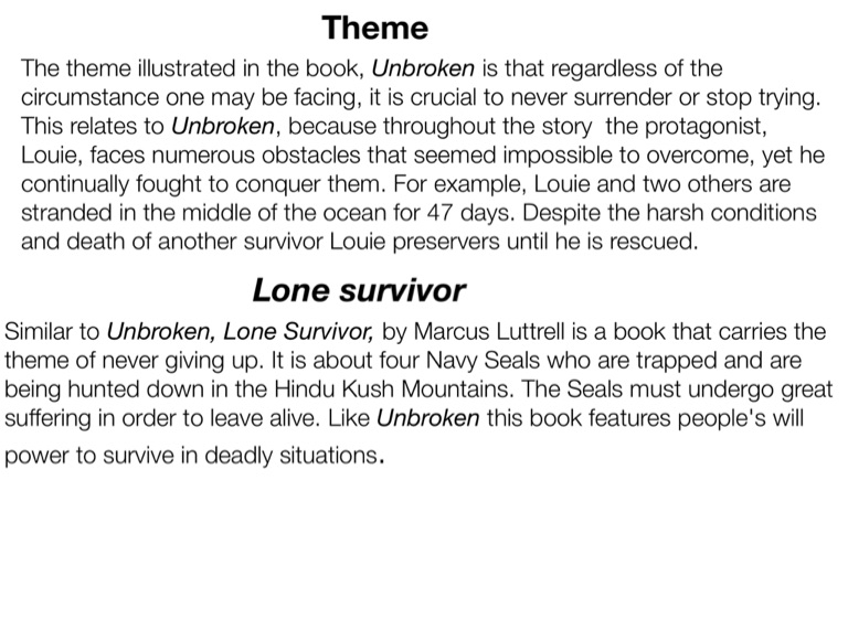 The theme illustrated in the book, Unbroken is that regardless of the circumstance one may be facing, it is crucial to never surrender or stop trying. This relates to Unbroken, because throughout the story the protagonist, Louie, faces numerous obstacles that seemed impossible to overcome, yet he continually fought to conquer them. For example, Louie and two others are stranded in the middle of the ocean for 47 days. Despite the harsh conditions and death of another survivor Louie preservers until he is rescued.
