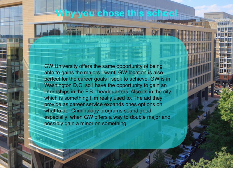 GW University offers the same opportunity of being able to gains the majors I want. GW location is also perfect for the career goals I seek to achieve. GW is in Washington D.C so I have the opportunity to gain an internships in the F.B.I headquarters. Also its in the city which is something I' m really used to. The aid they provide as career service expands ones options on what to do. Criminalogy programs sound good especially when GW offers a way to double major and possibly gain a minor on something.