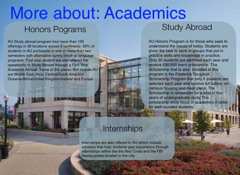 Internships are also offered in AU which include advisors that help students gain experience through internships within the the Red Cross and the FBI headquarters located in the city.
