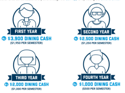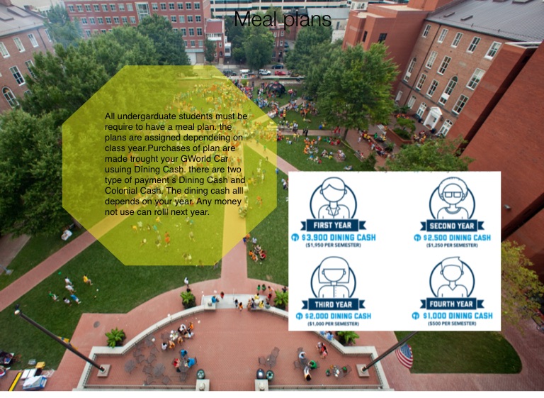 All undergarduate students must be require to have a meal plan. the plans are assigned dependeing on class year.Purchases of plan are made trought your GWorld Car usuing Dîning Cash. there are two type of payment s Dining Cash and Colonial Cash. The dining cash alll depends on your year. Any money not use can rolll next year.