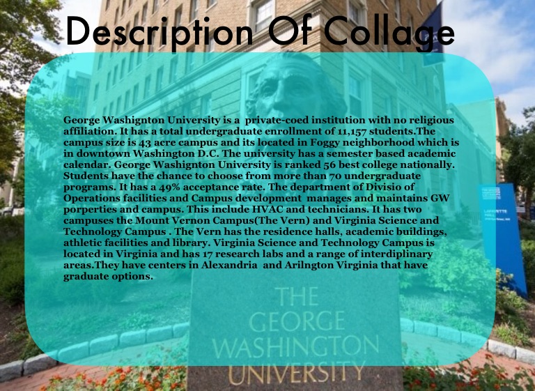 George Washignton University is a private-coed institution with no religious affiliation. It has a total undergraduate enrollment of 11,157 students.The campus size is 43 acre campus and its located in Foggy neighborhood which is in downtown Washington D.C. The university has a semester based academic calendar. George Washignton University is ranked 56 best college nationally. Students have the chance to choose from more than 70 undergraduate programs. It has a 49% acceptance rate. The department of Divisio of Operations facilities and Campus development manages and maintains GW porperties and campus. This include HVAC and technicians. It has two campuses the Mount Vernon Campus(The Vern) and Virginia Science and Technology Campus . The Vern has the residence halls, academic buildings, athletic facilities and library. Virginia Science and Technology Campus is located in Virginia and has 17 research labs and a range of interdiplinary areas.They have centers in Alexandria and Arilngton Virginia that have graduate options.