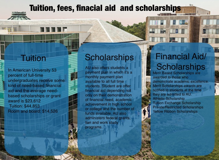 In American University 53 percent of full-time undergraduates receive some kind of need-based financial aid and the average need-based scholarships or grant award is $23,612