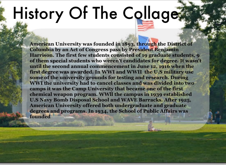 American University was founded in 1893, through the District of Columbia by an Act of Congress pass by President Benjamin Harrison. The first few students consisted of 19 graduate students, 9 of them special students who weren't candidates for degree. It wasn't until the second annual commencement in June 12, 1916 when the first degree was awarded. In WWI and WWII the U.S military use some of the university grounds for testing and research. During WWI the university had to cancel classes and was divided into two camps it was the Camp University that became one of the first chemical weapon program. WWll the campus in 1939 established U.S Navy Bomb Disposal School and WAVE Barracks. After 1925, American University offered both undergraduate and graduate degrees and programs. In 1934, the School of Public Affairs was founded