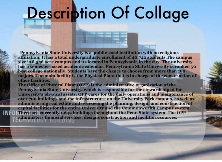 Pennsylvania State University is a public-coed institution with no religious affiliation. It has a total undergraduate enrollment of 40,742 students.The campus size is 8,556 acre campus and its located in Pennsylvania in the city. The university has a semester based academic calendar. Pennsylvania State University is ranked 50 best college nationally. Students have the chance to choose from more than 160 majors. The main facility is the Phyaical Plant that is in charge of the construction of other facilities.