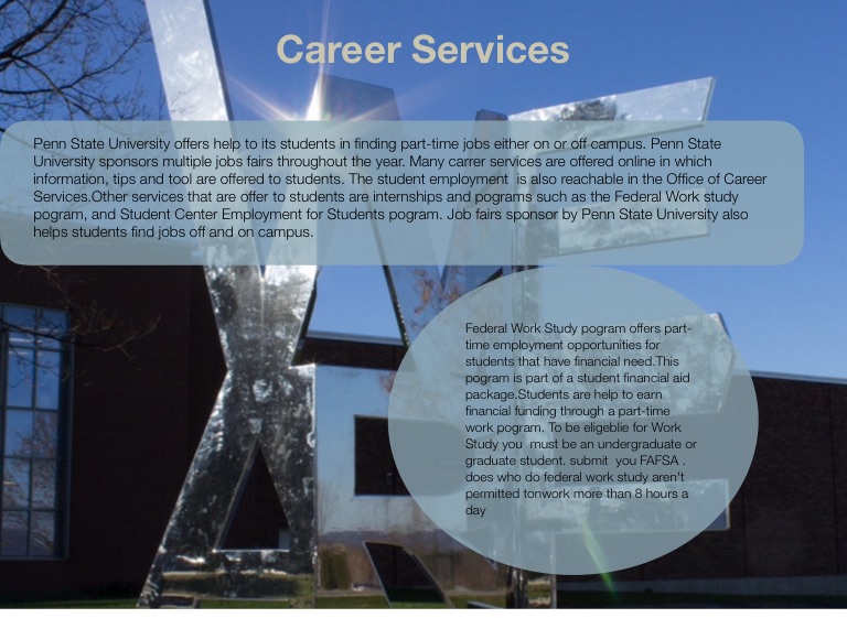 Penn State University offers help to its students in finding part-time jobs either on or off campus. Penn State University sponsors multiple jobs fairs throughout the year. Many carrer services are offered online in which information, tips and tool are offered to students. The student employment is also reachable in the Office of Career Services.Other services that are offer to students are internships and pograms such as the Federal Work study pogram, and Student Center Employment for Students pogram. Job fairs sponsor by Penn State University also helps students find jobs off and on campus.
