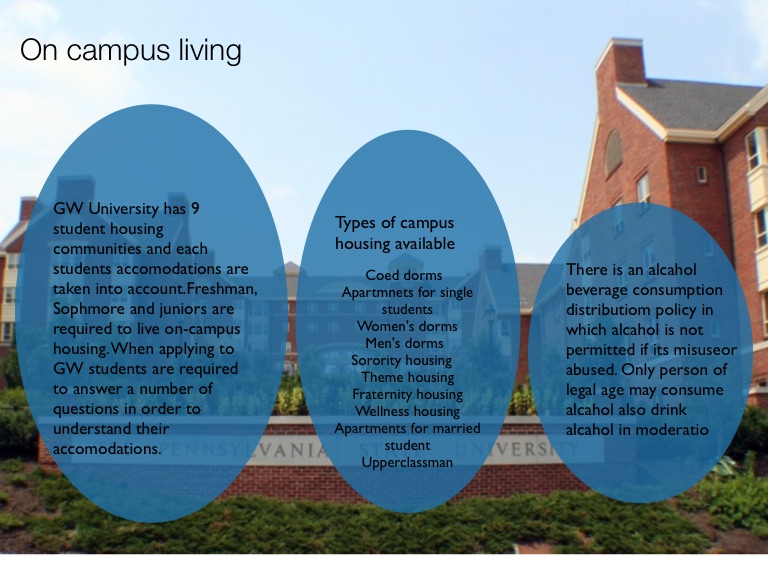 GW University has 9 student housing communities and each students accomodations are taken into account.Freshman, Sophmore and juniors are required to live on-campus housing. When applying to GW students are required to answer a number of questions in order to understand their accomodations.