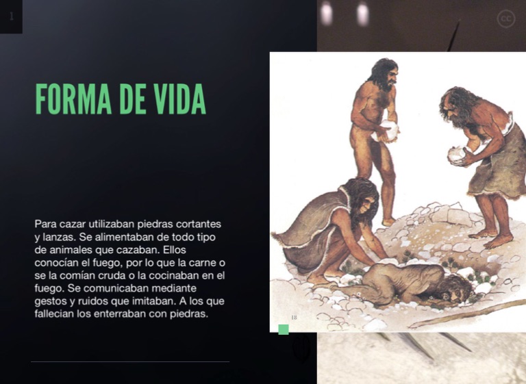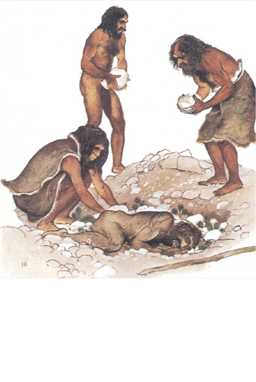 Para cazar utilizaban piedras cortantes y lanzas. Se alimentaban de todo tipo de animales que cazaban. Ellos conocían el fuego, por lo que la carne o se la comían cruda o la cocinaban en el fuego. Se comunicaban mediante gestos y ruidos que imitaban. A los que fallecian los enterraban con piedras.