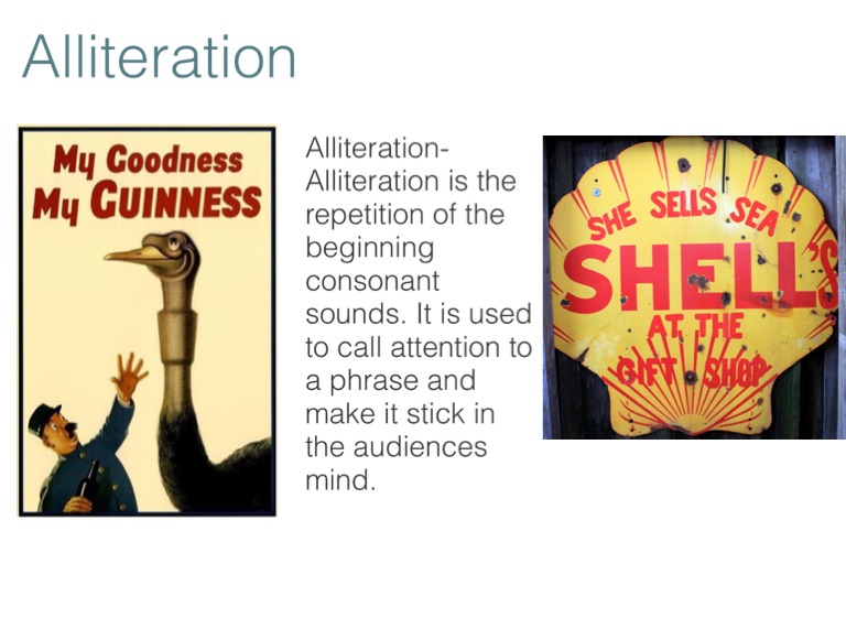 Alliteration is the repetition of the beginning consonant sounds. It is used to call attention to a phrase and make it stick in the audiences mind.