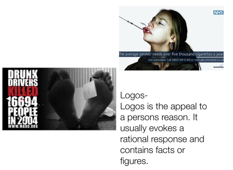 Logos is the appeal to a persons reason. It usually evokes a rational response and contains facts or figures.