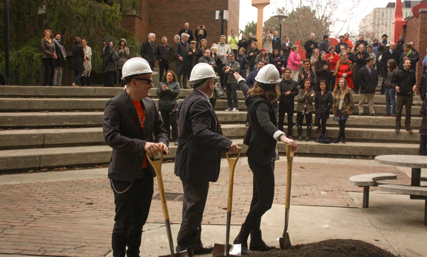 ASU president Dylan Ball, Dean of Arts Douglas Peers, and Hannah Beckett, Representative of AEF, waving to the crowd in preparation for the groundbreaking ceremony.