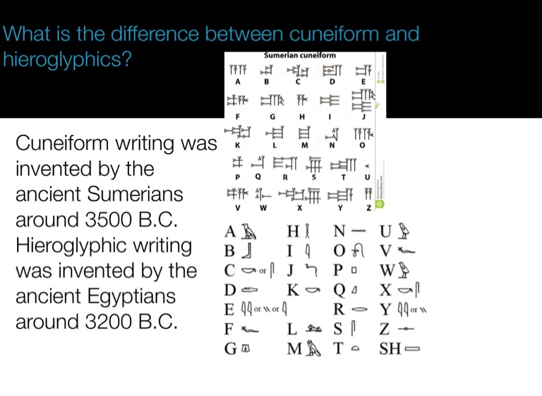Cuneiform writing was invented by the ancient Sumerians around 3500 B.C. Hieroglyphic writing was invented by the ancient Egyptians around 3200 B.C.