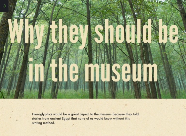 Hieroglyphics would be a great aspect to the museum because they told stories from ancient Egypt that none of us would know without this writing method.