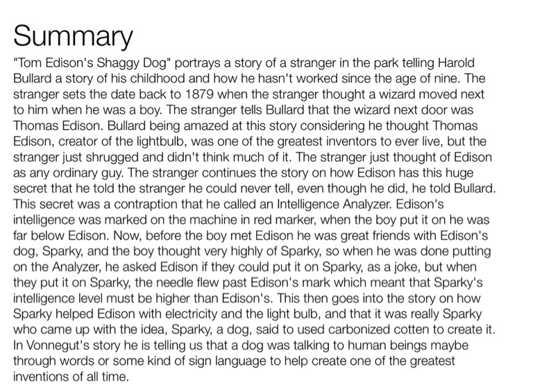 "Tom Edison's Shaggy Dog" portrays a story of a stranger in the park telling Harold Bullard a story of his childhood and how he hasn't worked since the age of nine. The stranger sets the date back to 1879 when the stranger thought a wizard moved next to him when he was a boy. The stranger tells Bullard that the wizard next door was Thomas Edison. Bullard being amazed at this story considering he thought Thomas Edison, creator of the lightbulb, was one of the greatest inventors to ever live, but the stranger just shrugged and didn't think much of it. The stranger just thought of Edison as any ordinary guy. The stranger continues the story on how Edison has this huge secret that he told the stranger he could never tell, even though he did, he told Bullard. This secret was a contraption that he called an Intelligence Analyzer. Edison's intelligence was marked on the machine in red marker, when the boy put it on he was far below Edison. Now, before the boy met Edison he was great friends with Edison's dog, Sparky, and the boy thought very highly of Sparky, so when he was done putting on the Analyzer, he asked Edison if they could put it on Sparky, as a joke, but when they put it on Sparky, the needle flew past Edison's mark which meant that Sparky's intelligence level must be higher than Edison's. This then goes into the story on how Sparky helped Edison with electricity and the light bulb, and that it was really Sparky who came up with the idea, Sparky, a dog, said to used carbonized cotten to create it. In Vonnegut's story he is telling us that a dog was talking to human beings maybe through words or some kind of sign language to help create one of the greatest inventions of all time.