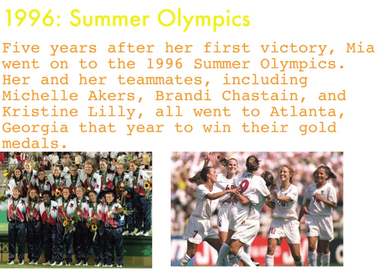 Five years after her first victory, Mia went on to the 1996 Summer Olympics. Her and her teammates, including Michelle Akers, Brandi Chastain, and Kristine Lilly, all went to Atlanta, Georgia that year to win their gold medals.