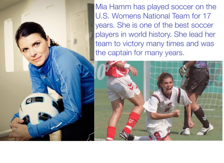 Mia Hamm has played soccer on the U.S. Womens National Team for 17 years. She is one of the best soccer players in world history. She lead her team to victory many times and was the captain for many years.