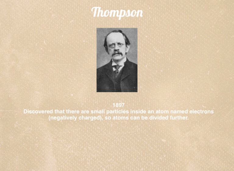 Discovered that there are small particles inside an atom named electrons (negatively charged), so atoms can be divided further.