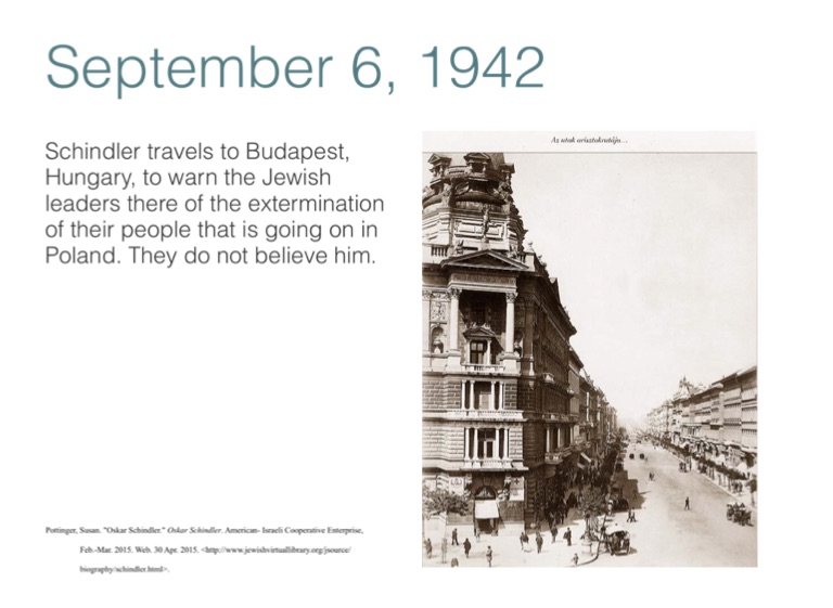 Schindler travels to Budapest, Hungary, to warn the Jewish leaders there of the extermination of their people that is going on in Poland. They do not believe him.