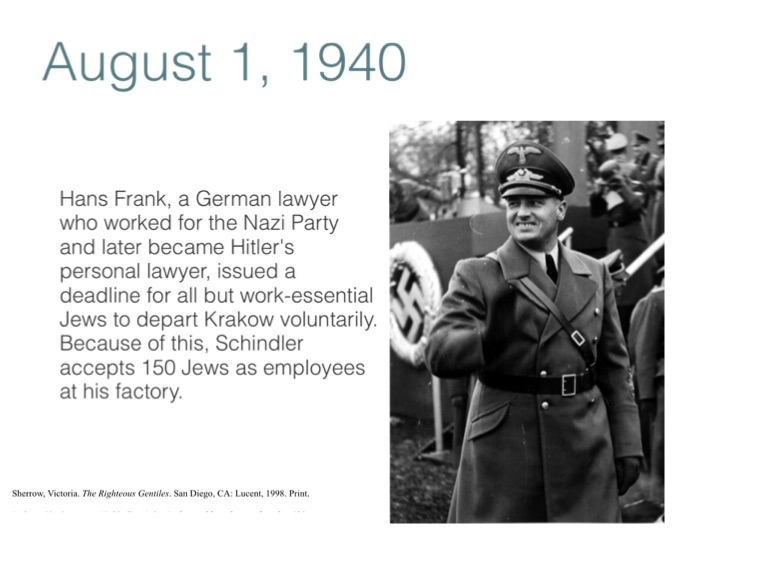 Hans Frank, a German lawyer who worked for the Nazi Party and later became Hitler's personal lawyer, issued a deadline for all but work-essential Jews to depart Krakow voluntarily. Because of this, Schindler accepts 150 Jews as employees at his factory.