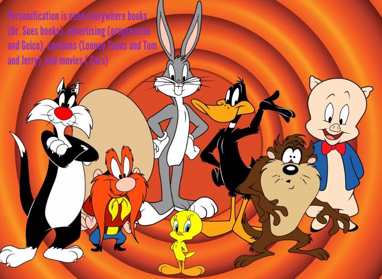 Personification is used everywhere books (Dr. Sues books), advertising (progressive and Geico), cartoons (Looney Toons and Tom and Jerry), and movies ( Cars)
