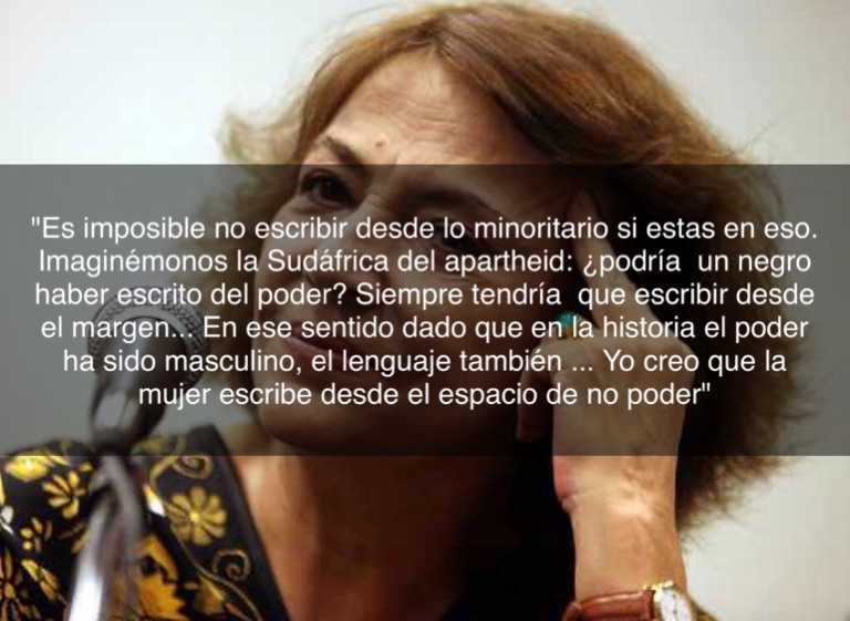"Es imposible no escribir desde lo minoritario si estas en eso. Imaginémonos la Sudáfrica del apartheid: ¿podría un negro haber escrito del poder? Siempre tendría que escribir desde el margen... En ese sentido dado que en la historia el poder ha sido masculino, el lenguaje también ... Yo creo que la mujer escribe desde el espacio de no poder"