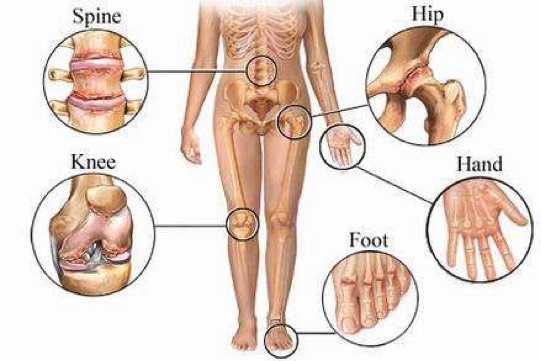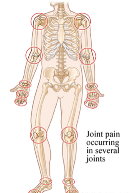 Pain and stiffness in the affected joint (hip, knee, toes and fingers).