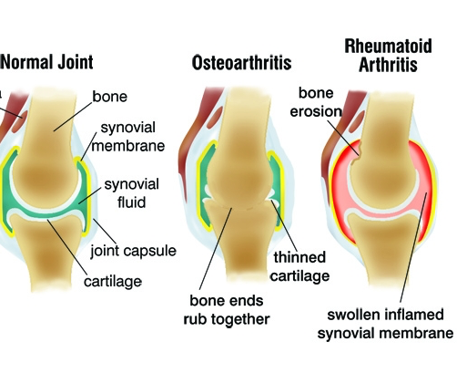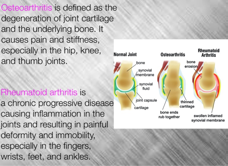 degeneration of joint cartilage and the underlying bone. It causes pain and stiffness, especially in the hip, knee, and thumb joints.