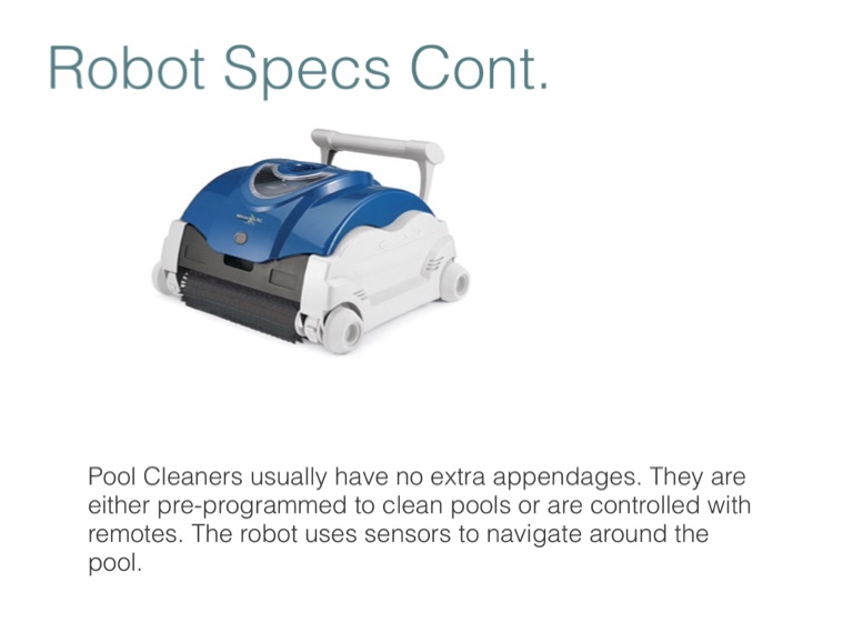 Pool Cleaners usually have no extra appendages. They are either pre-programmed to clean pools or are controlled with remotes. The robot uses sensors to navigate around the pool.
