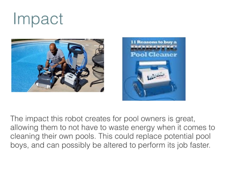 The impact this robot creates for pool owners is great, allowing them to not have to waste energy when it comes to cleaning their own pools. This could replace potential pool boys, and can possibly be altered to perform its job faster.