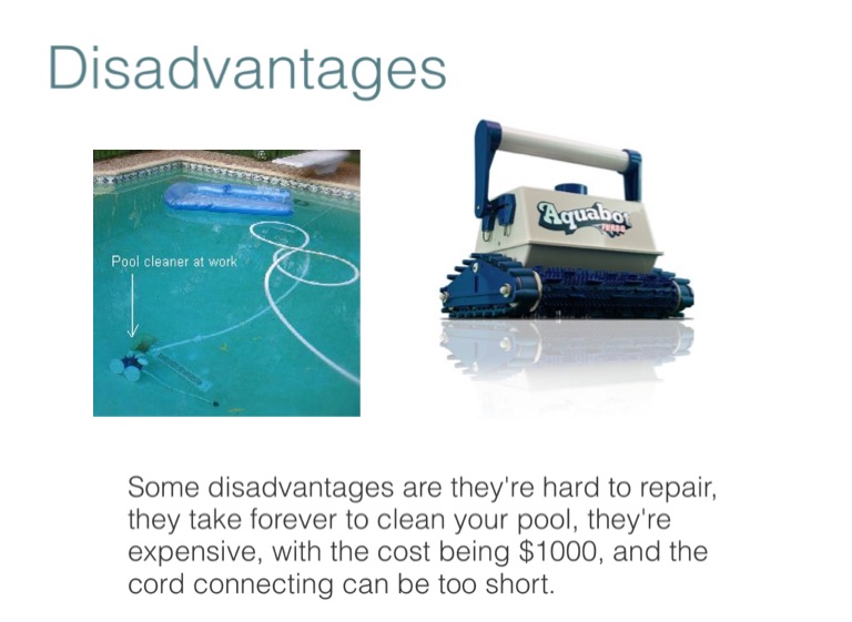 Some disadvantages are they're hard to repair, they take forever to clean your pool, they're expensive, with the cost being $1000, and the cord connecting can be too short.