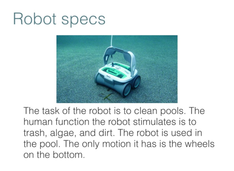 The task of the robot is to clean pools. The human function the robot stimulates is to trash, algae, and dirt. The robot is used in the pool. The only motion it has is the wheels on the bottom.