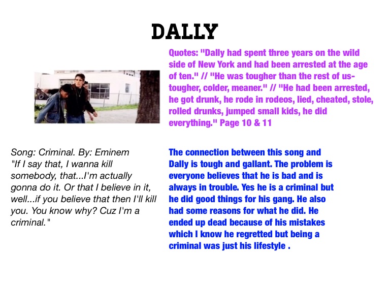 The connection between this song and Dally is tough and gallant. The problem is everyone believes that he is bad and is always in trouble. Yes he is a criminal but he did good things for his gang. He also had some reasons for what he did. He ended up dead because of his mistakes which I know he regretted but being a criminal was just his lifestyle .