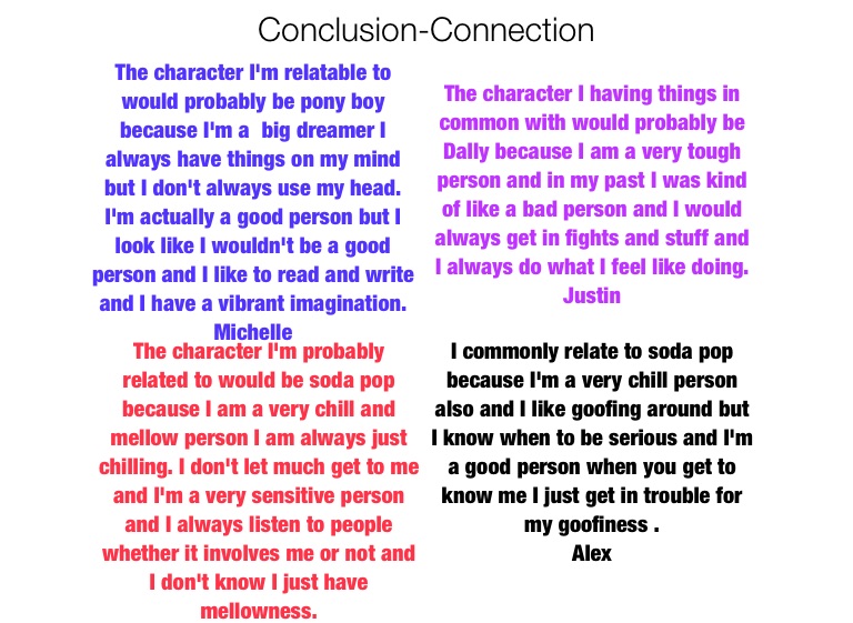 The character I'm relatable to would probably be pony boy because I'm a big dreamer I always have things on my mind but I don't always use my head. I'm actually a good person but I look like I wouldn't be a good person and I like to read and write and I have a vibrant imagination.