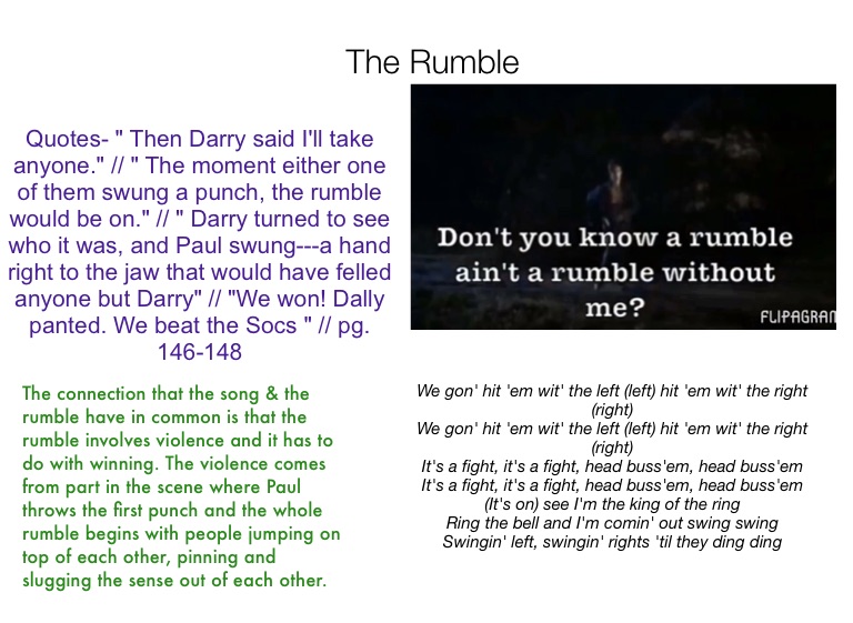 The connection that the song & the rumble have in common is that the rumble involves violence and it has to do with winning. The violence comes from part in the scene where Paul throws the first punch and the whole rumble begins with people jumping on top of each other, pinning and slugging the sense out of each other.
