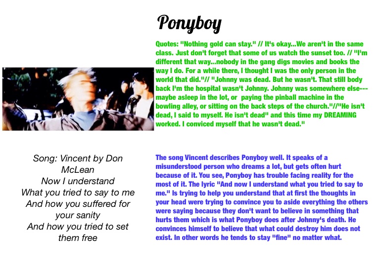 The song Vincent describes Ponyboy well. It speaks of a misunderstood person who dreams a lot, but gets often hurt because of it. You see, Ponyboy has trouble facing reality for the most of it. The lyric "And now I understand what you tried to say to me." Is trying to help you understand that at first the thoughts in your head were trying to convince you to aside everything the others were saying because they don't want to believe in something that hurts them which is what Ponyboy does after Johnny's death. He convinces himself to believe that what could destroy him does not exist. In other words he tends to stay "fine" no matter what.
