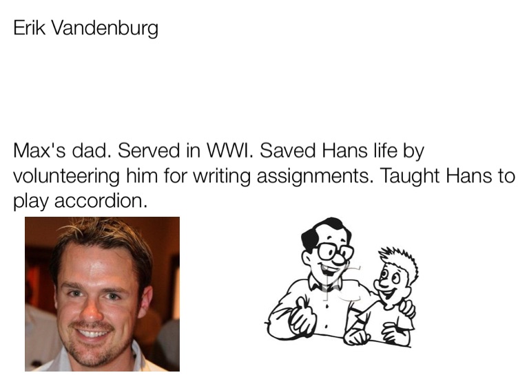 Max's dad. Served in WWI. Saved Hans life by volunteering him for writing assignments. Taught Hans to play accordion.