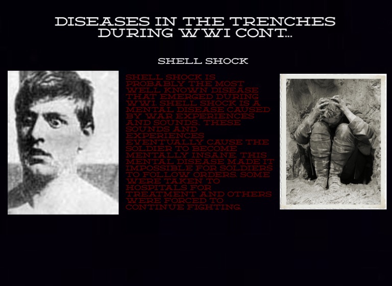 Shell shock is probably the most well known disease that emerged during WWI. Shell shock is a mental disease caused by war experiences and sounds.. These sounds and experiences eventually cause the soldier to become mentally insane. This mental disease made it impossible for soldiers to follow orders. Some were taken to hospitals for treatment and others were forced to continue fighting.