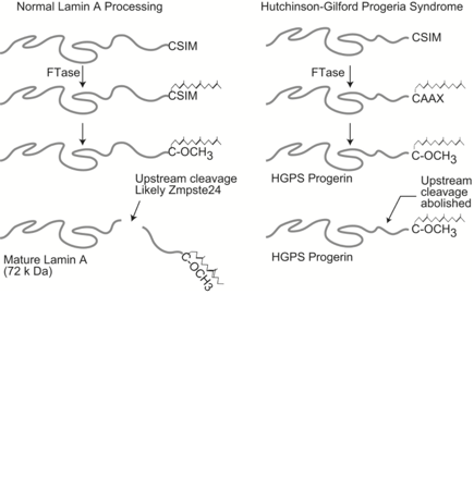 -Progerin is made when the farnesyl group remains attached to the prelamin instead of being removed from it