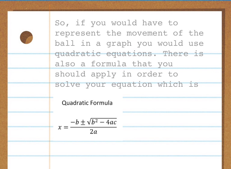 So, if you would have to represent the movement of the ball in a graph you would use quadratic equations. There is also a formula that you should apply in order to solve your equation which is the following: