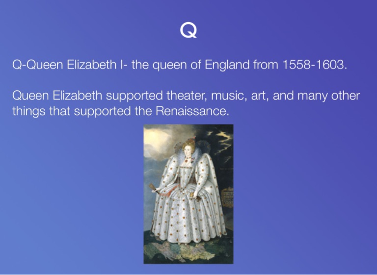 Q-Queen Elizabeth I- the queen of England from 1558-1603.