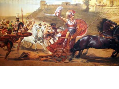 The Iliad is composed of 15,693 hexameters (lines of verse), and is divided into 24 books corresponding to each letter of the Greek alphabet - alpha to omega. It narrates the es the anger of Achilles and takes place over 51 days during the tenth and final year of the Trojan War. The poem takes its name from the city of Troy, which is also known as Ilium.